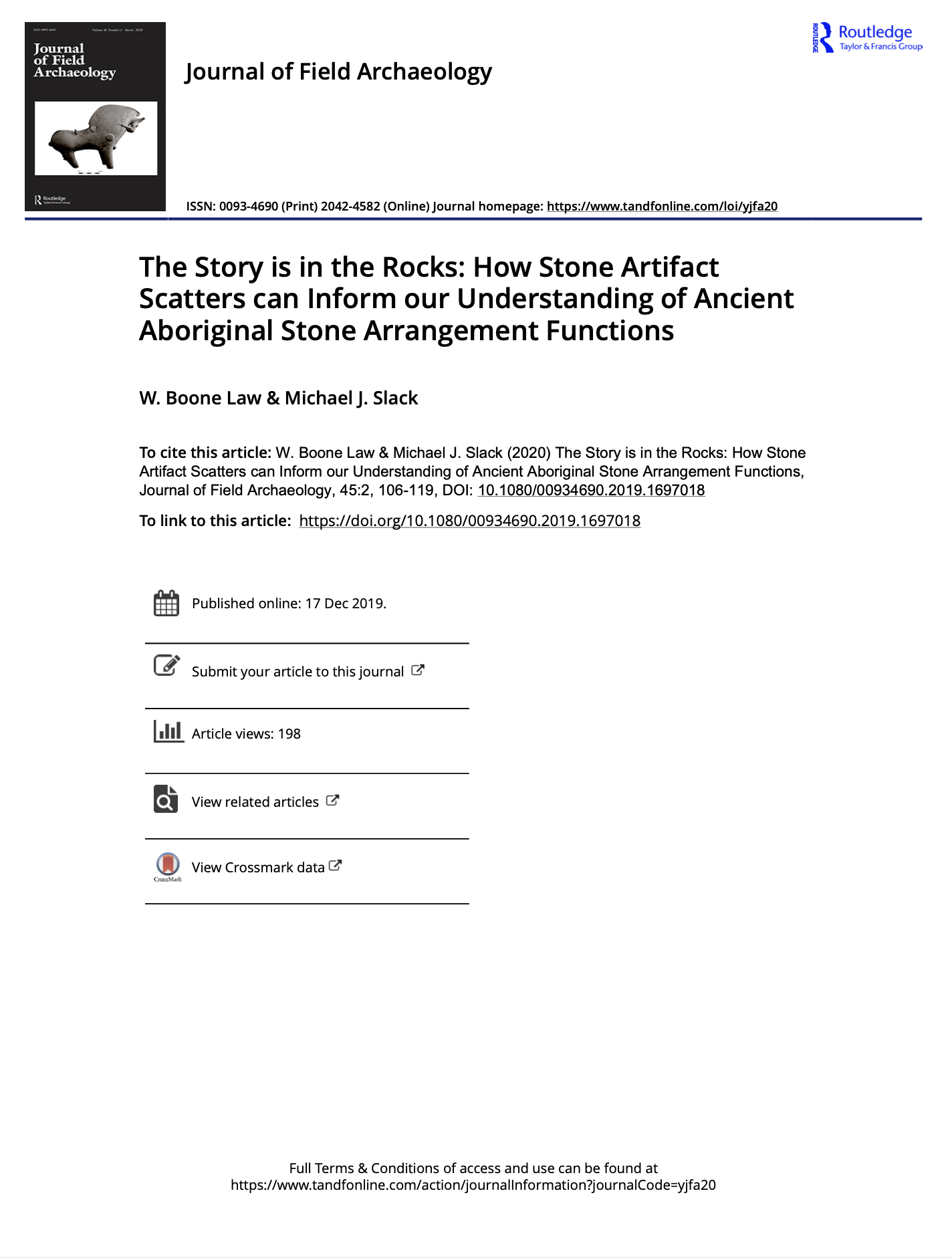To cite this article: W. Boone Law & Michael J. Slack (2020) The Story is in the Rocks: How Stone Artifact Scatters can Inform our Understanding of Ancient Aboriginal Stone Arrangement Functions, Journal of Field Archaeology, 45:2, 106-119, DOI: 10.1080/00934690.2019.1697018
